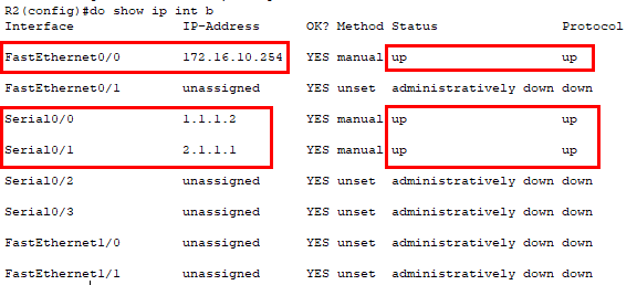 왼쪽은 포트 이름과 그 포트에 부여된 IP 오른쪽은 포트의 개방 여부. up은 개방, 연결되었다는 거고, down은 개방은 되었지만 연결이 안되었다는 것,. administratively down 은 개방이 안되었다는 것