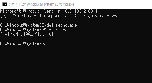 sethc.exe 를 관리자 권한으로 제거하려고 하면 위처럼 거부 되는 것을 알 수 있다.