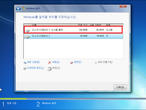 위처럼 첫번째 파티션에 시스템 예약이 들어가 있었다.