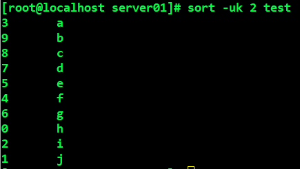 | ex | #cat > test 9 b 3 a 5 e 7 d 8 c 4 f 1 j 0 h 2 i 6 g #sort test ![]() 첫행 첫열을 기준으로 오름차순 정렬 #sort -r test ![]() 첫행 첫열을 기준으로 내림차순 정렬 #sort -k 2 test ![]() 2열을 기준으로 정렬 #sort -uk 2 test ![]() 2열 기준으로 중복 제거한뒤 정렬. (여기선 중복된게 없으니 똑같다) |