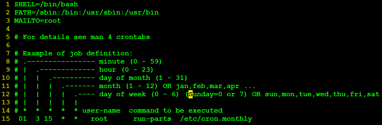 vi 편집기로 /etc/crontab 을 열면 파일의 형식을 볼 수 있다.
