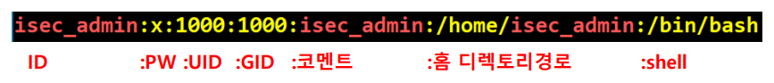 이렇게 구성되어있으며 2번필드의 암호는 암호화되어 저장되는 파일이므로 직접 수정해서는 안된다.