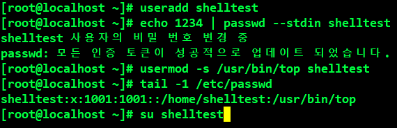 shelltest 계정을 하나 만들어서 usermod로 쉘의 경로를 명령어 top의 경로로 설정 해줬다.