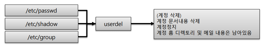 - #userdel으로 사용자계정을 지울 경우 계정 생성시 만들어지는 문서파일(/etc/passwd, /etc/shadow, /etc/group)만 삭제된다.