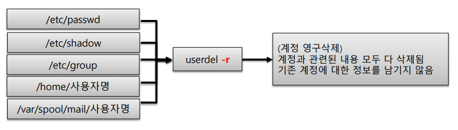 - #userdel -r 로 사용할 경우 계정 생성시 만들어지는 문서파일과 디렉터리 모두 삭제된다.
