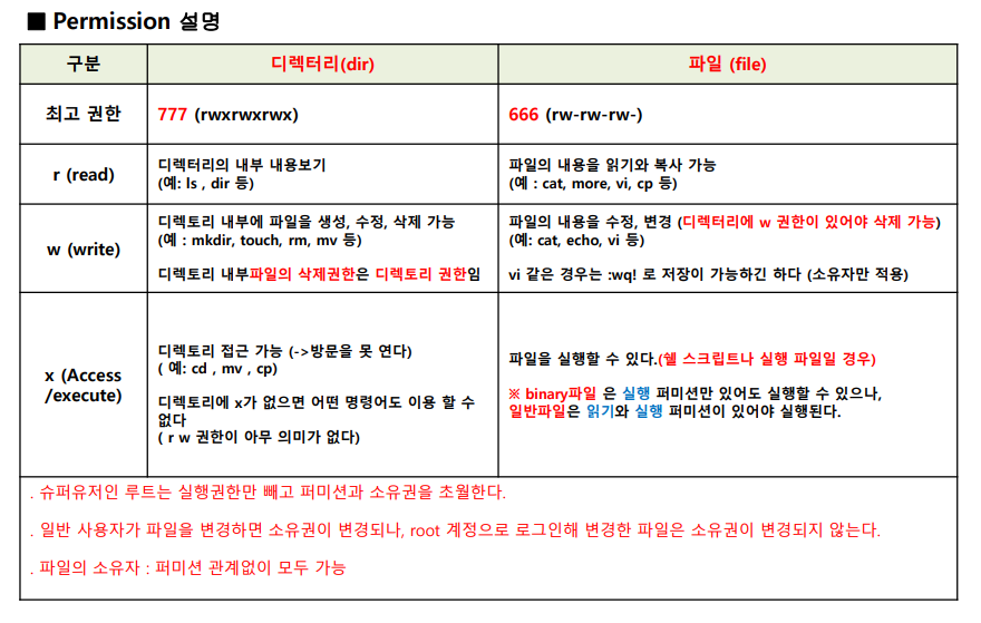 - 디렉터리를 수정할 때 유의해야할 점은 디렉터리에 접근하려면 실행권한이 무조건 있어야한다. rw권한은 있는데 x권한이 없으면 아무것도 할 수 없다.