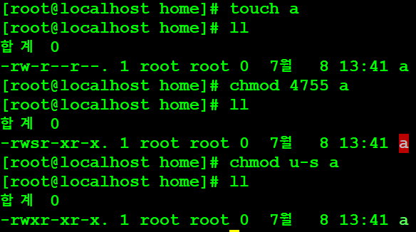 - chmod u±s 혹은 chmod 4천번대로 설정할 수 있다.