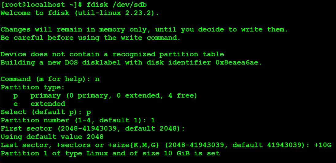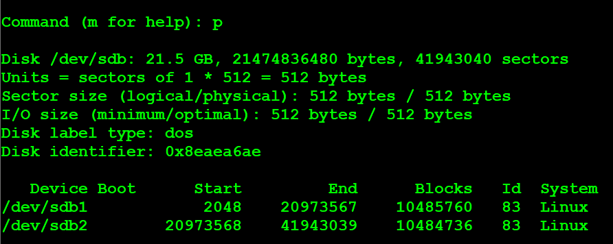 여기서 sdb를 2개의 파티션으로 10GB 씩 분할한다.