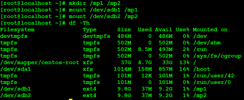 그렇기에 마운트를 해줄 디렉터리 mp1, mp2를 만들고 여기에 각각 sdb1, sdb2를 연결 할 것이다.