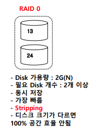 - 속도가 매우빠르고 복구기능이 없기 때문에 하드가 하나라도 다운되면 전체 데이터가 소실된다.