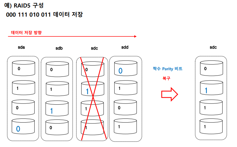 - 빠른속도에 장애복구 기능이 추가됐다. (RAID 0 보다는 느림)